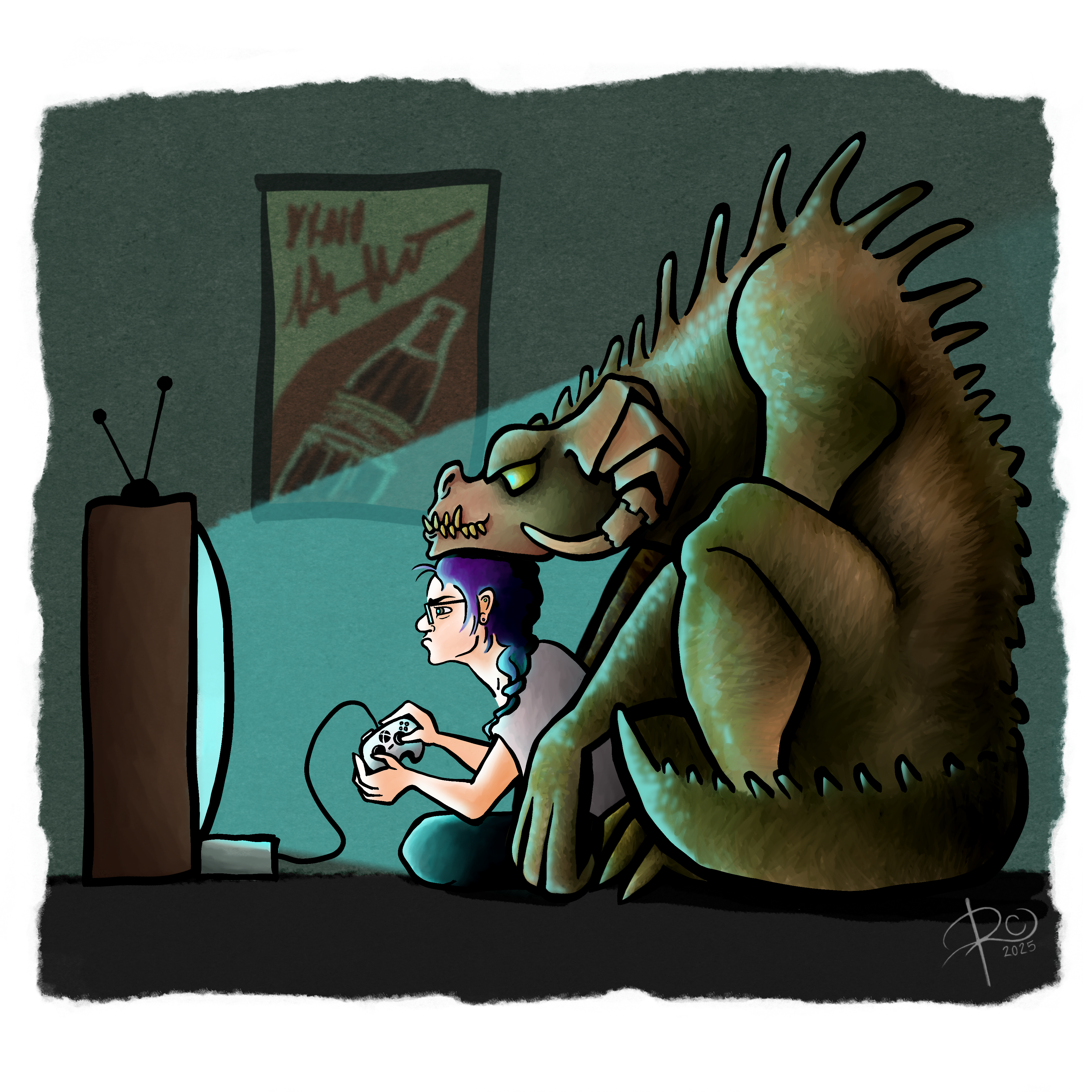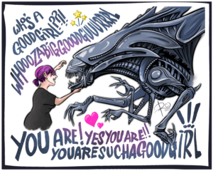 Pop culture, video game, sci-fi, fantasy… I’m drawn (HA!) to create whatever hyperfixation currently grabs my brain. I mainly start off creating just for myself, but I’m always surprised (and delighted) when others share my love of niche stuff and get excited about my art. ALWAYS shine your weird light so other weirdos can find you!